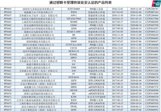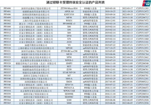 以下為通過銀聯受理終端安全證人的產品列表: