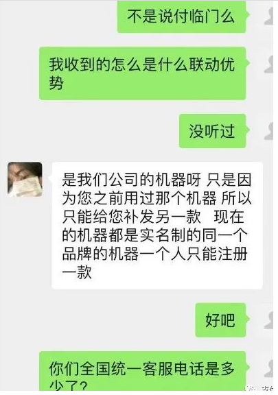 自稱客服和用戶聯(lián)系,說(shuō)要郵寄付臨門的機(jī)器,收到的卻是聯(lián)動(dòng)優(yōu)勢(shì)的機(jī)器。客服解釋同一個(gè)品牌的機(jī)器一個(gè)人只能注冊(cè)一款!