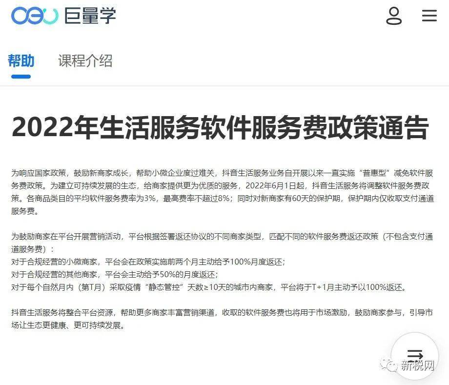 抖音《2022年生活服務(wù)軟件服務(wù)費(fèi)政策通告》通告顯示,自2022年6月1日起,抖音生活服務(wù)將調(diào)整軟件服務(wù)費(fèi)政策。各商品類目的平均軟件服務(wù)費(fèi)率為 3%,最高費(fèi)率不超過 8%;同時(shí)對新商家有 60 天的保護(hù)期,保護(hù)期內(nèi)僅收取支付通道服務(wù)費(fèi)。