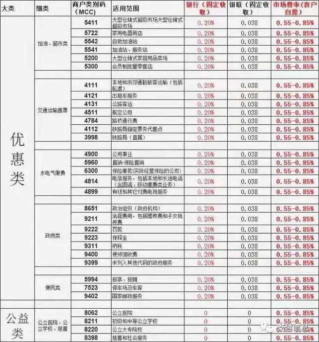 有的機器前五分鐘刷卡在北京,五分鐘之后刷卡在西安,這是不合理的。商戶類別碼顯示的是刷卡費率,如果你刷的都是優惠類及公益類,銀行是不賺錢的,對用卡人來講,是不利于用卡提額的。以下是部分費率表,可以對應查詢刷卡費率是多少。